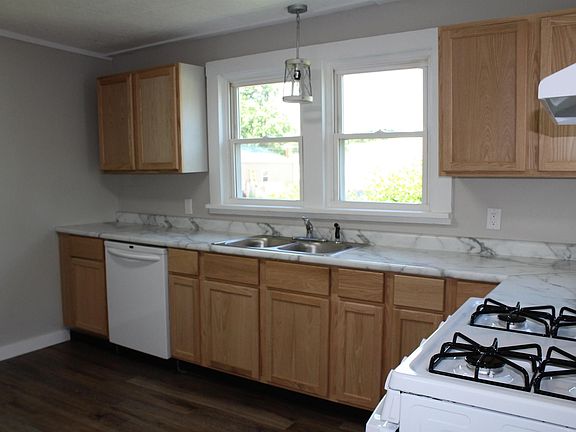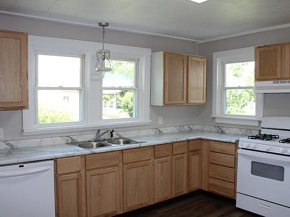 Recently updated! This 2 bedroom, 1 bath home is move-in ready! Completely updated with neutral interior paint, carpeting, vinyl plank flooring, and light fixtures throughout. The bathroom and kitchen have been updated as well. The kitchen has plenty of cabinet space, dishwasher, and gas stove. There's room for an eat-in area in the kitchen and a formal dining room too. Bright main floor laundry room offering lots of natural lighting, could be used as a cozy sun room as well. Conveniently located on a deep corner lot with covered front porch and patio. Come take a look!