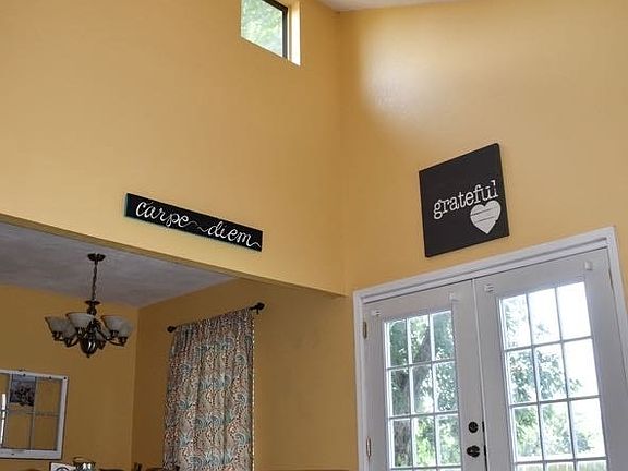 High ceiling in family room w/corner wood burning fireplace, sky light windows. Granite counter top, wood style laminate flooring. Camera security system, master has double closets! Lots of storage space, ceiling fans in all bedrooms and living room. French doors to back patio! Quiet neighborhood. Come check it out!