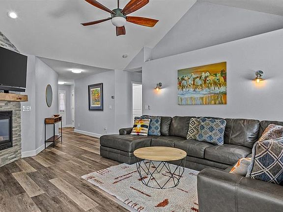 Welcome to this stunning, fully updated home, perfectly situated on a corner lot across from a serene neighborhood park and lake. This move-in-ready gem boasts an open floor plan, bathed in natural light, with mountain views visible through the charming bay window. The bright and sunny kitchen features new cabinets, beautiful granite countertops, and modern appliances. The home is adorned with beautiful vinyl plank flooring throughout, complemented by stylish tile in the bathrooms, which also showcase granite counters and updated light fixtures. Step outside to the concrete rear patio, ideal for entertaining, and enjoy the privacy of a lovely vinyl-fenced backyard, complete with a sprinkler system and mature trees offering shade and seclusion. Cozy up by the gas fireplace in the inviting living area, or relax in the bathrooms equipped with Bluetooth speakers for a touch of modern luxury. With a private backyard, buffered by open space and proximity to the park and pond, this home blends comfort, style, and entertaining. Move in and make it your own.
