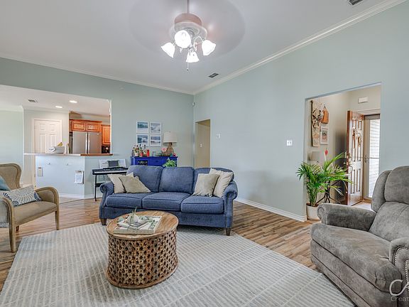 Welcome to this beautiful 4 bed, 2 bath home on a corner lot in the highly sought-after Lytle South neighborhood. Step inside to an open-concept layout with tall ceilings, fresh laminate flooring in the living room, and a charming white-washed brick fireplace framed with crown molding. The split floor plan offers privacy, with the spacious primary suite featuring a tray ceiling, dual walk-in closets, and a spa-like bathroom with a soaking tub, separate shower, and dual vanity. The kitchen boasts brand-new stainless steel appliances. Outside, enjoy the oversized covered patio, perfect for entertaining, plus a 9x12 storage building with electricity for all your hobbies or extra storage needs. Major updates include a brand-new HVAC system in 2024 and a new roof to be installed before closing.