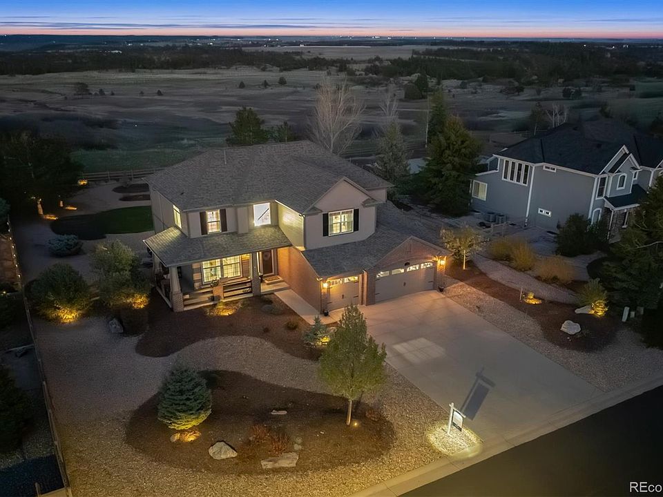 Experience true Colorado luxury living in this exceptional west-facing home, perfectly positioned for faster snow melt and less shoveling. Over 600 acres of open space stretch behind the property, offering breathtaking views, abundant wildlife, and unmatched privacy. Start your mornings with coffee at sunrise, watching deer, turkey, & hawks roam the landscape — a rare blend of serenity and connection to nature. Inside, the home showcases refined craftsmanship & thoughtful design throughout. The centerpiece is a gourmet walk-in working butler’s kitchen paired with a main kitchen, combining style & function with premium appliances, generous prep space, & custom cabinetry — ideal for both everyday living & entertaining. A striking two-story great room with expansive windows, plantation shutters, & a curated wine library adds a touch of sophistication and warmth. The main level offers a versatile bedroom or private office, stylish laundry room with built-in cabinetry & bench, custom staircase accented by modern wrought iron railings. Upstairs, the primary suite captures sweeping views & features a luxurious five-piece bath with a frameless glass shower, soaking tub, dual vanities, & a generous walk-in closet. Two additional bedrooms each enjoy their own full ensuite baths, providing comfort & privacy for all. The finished basement extends the living space with a sprawling recreation area, two additional bedrooms—perfect for a gym, studio, or guest retreat—& a beautifully tiled full bath, creating endless possibilities for relaxation and entertaining.