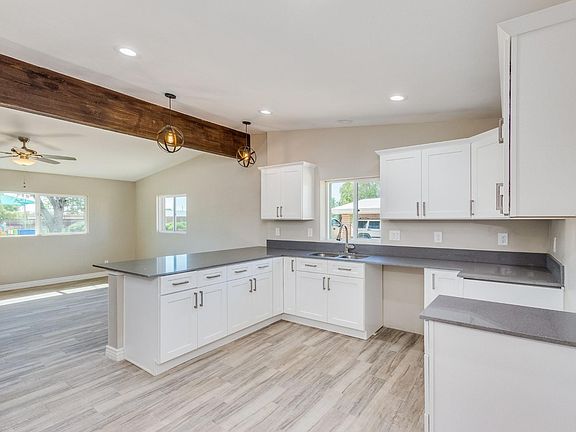 Lovely 3 bedroom 2 bath remodeled home on large lot. New heat pump, dual pane windows and water heater. Inside is bright and open with vaulted ceilings, an abundance of natural lighting and a charming exposed ceiling beam. Stylish open kitchen with a breakfast bar. Kitchen features new cabinets offering plenty of storage space & new gorgeous quartz counter-tops. Seller will provide new stainless steel appliances including smooth-top electric range, OTR microwave & dishwasher prior to closing. New elegant ceramic tile flooring & new baseboards throughout with new carpet & pad in all the bedrooms. Both bathrooms have new vanities, new mirrors & new beautiful tile shower surrounds with deco accents. New brushed nickel light fixtures ceiling fans, plumbing fixtures. Agent/Owner