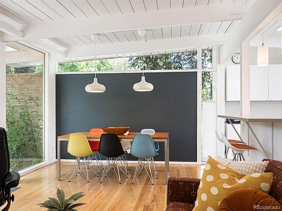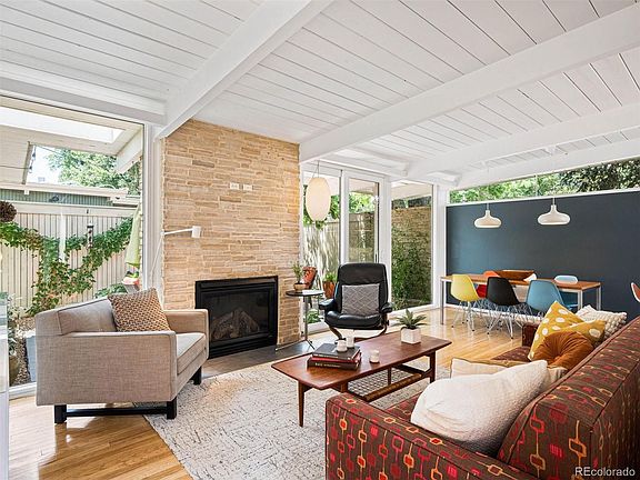 Gorgeous Krisana Park Mid-Mod Gem. This prime 3B/2b Usonian/Eichler style home was designed and built by Brad Wolff and boasts classic mid-mod post-and-beam construction with tons of light and a great expanded lay out. One of the larger original layouts with a EXTRA 80SF attached heated studio not counted in the square footage. Fully updated kitchen with quartz, stainless, breakfast counter, lots of storage in added bank of cabinets, and plenty of counter space. Clerestory windows and sliding-door grant access to the serene lanai, seamlessly blending indoor and outdoor spaces. Wall of glass between living space and lanai is anchored by a stone covered gas fireplace with gas hookup outside. Fully updated throughout, and thoughtfully enhanced with attached garage, significantly expanded closets in 2 bedrooms, updated baths, elegant outdoor living spaces and luxurious garden areas. Ensuite primary bedroom is airy and swank. Sliding doors to private back yard enhance two of the three bedrooms. Spectacular landscaping with sprinklers front and back. Spacious back patio and large lot allow for even more living space outdoors. This is one of only a handful of lots in Krisana Park that would allow the addition of a large side-load garage. Part of current garage is partitioned for studio and poses many options for reconfiguration. Krisana Park is Denver's Premier Mid-Mod Neighborhood and is the winner of the Mayor's Design Award. Easy access to Lightrail, Bike Trails, Shopping, Restaurants and Parks. Visit www.krisanapark.community for more info.