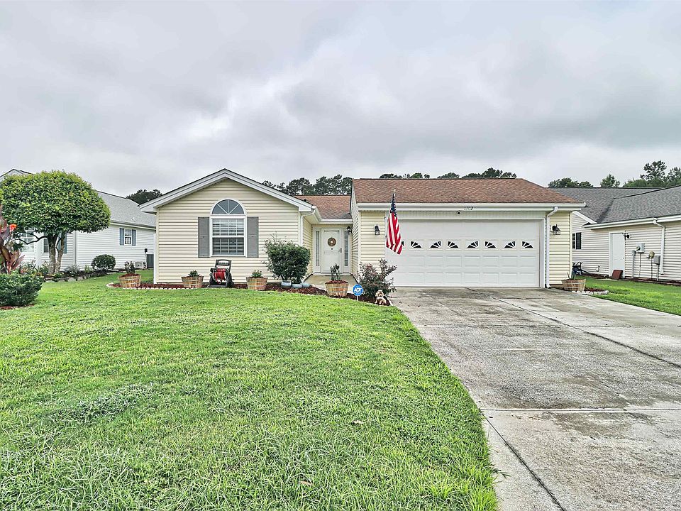 This wonderful home in Island Green South is move in ready. The home features, 3 bedrooms, 2 baths, updated kitchen with new stainless appliances, flooring, ceiling fan and granite counter tops, there is a pass through into the large dining room, the living room is spacious and bright with ceiling fan. The owners suite is in the back of the house with ensuite. There are two bedrooms at the front of the house with guest bath & laundry closet off the hallway. The large 2 car garage has storage closet, shelving, extra fridge and stand up freezer. There is a patio in the back of the house and several pear trees, crape myrtles surrounding the yard. Perfect location close to shopping, restaurants and just a short drive to the beach!