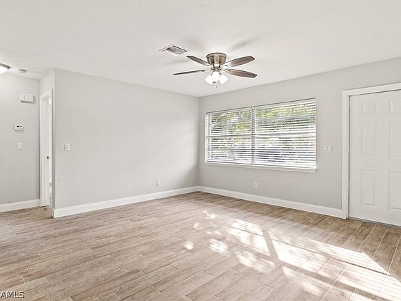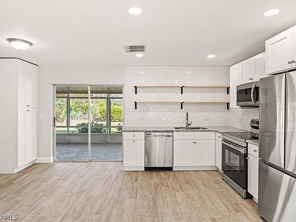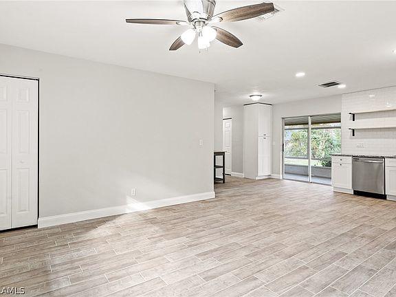 Do not miss your opportunity to call this beautifully renovated 4 bedroom, 2 bathroom ranch home! Extensively remodeled from floor to ceiling, this home features an open floor plan with updated recessed lighting, wood-look tile flooring throughout and a shed for extra storage. The new kitchen boasts soft-close, solid wood dovetail drawers and wood cabinetry, granite countertops, new Samsung stainless steel appliances, open shelving that is both aesthetic and functional, a pantry and movable breakfast bar/island. The primary bathroom has dual vanities with walk-in shower while the secondary bath features a garden tub with shower. Relax on the back screened-in lanai and enjoy the view of your large, fenced backyard with fruit trees or launch your boat at the Davis Boat Ramp located only minutes away. The oversized driveway can accommodate multiple cars and offers ample boat/trailer parking. New HVAC installed in 2021, with duct work and unit cleaned and serviced in January 2023. New water heater in 2020. Conveniently located within close proximity to I-75, shopping, restaurants, and a short drive to the Downtown Fort Myers River District.