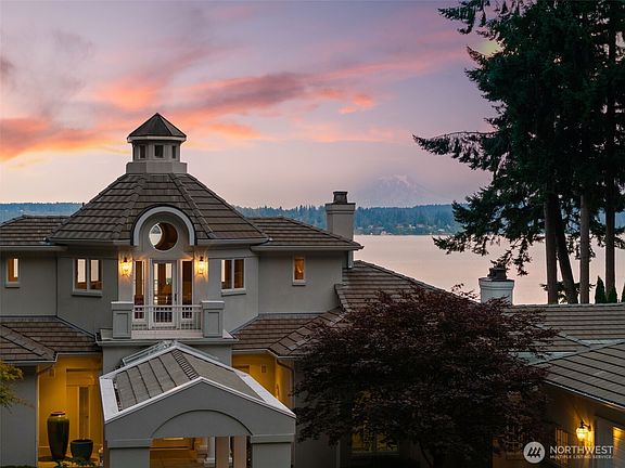 Architecturally significant and masterfully designed, this custom estate sits on 1.6ac, gated, exquisitely landscaped waterfront home has 183ft of private shoreline and a commanding, unobstructed view of Rainier. Crafted with quality materials and meticulously maintained systems, this residence radiates sophistication and quality throughout. All bedrooms are conveniently located on the main level, each featuring en-suite baths for optimal comfort and privacy. Expansive, sun-drenched living spaces flow seamlessly into the open-concept gourmet kitchen with chef-grade appliances. Step outside to a covered patio with a fireplace for year-round enjoyment, waterfront hot tub, and your own private garden walk. This is the epitome of PNW luxury.