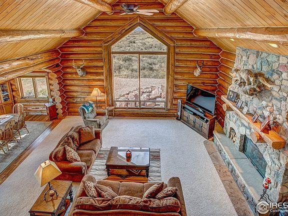 Dream big! This beautiful log home in Owl Canyon on 35 acres near Fort Collins is strategically located & designed to maximize privacy & offer unmatched views of open space & private ranches. You'll be amazed at how secluded it feels, but only a short easy drive! Quality construction! Full length hand peeled 12" diameter spruce logs from Montana. Well-designed floorplan. Hickory hardwood floors 4" planks, Aspen ceilings. Handcrafted log stairway to loft. Radiant floor heat. Split rock masonry inside & out. Vaulted ceilings, open loft/office area. Beautifully updated kitchen with pantry. Main floor master, 5pc bath. Finished 9ft ceiling basement w walk-out to flagstone patio. Oversize 812 sf garage, ambiant heat from boiler system. Sun porch. Storage room (~15 x 11) in basement. Chicken coop! * PRIVATE ROAD DO NOT GO TO HOUSE W/OUT PERMISSION * Enjoy the video tour! https://kuula.co/share/7XPnK/collection/7ldvd