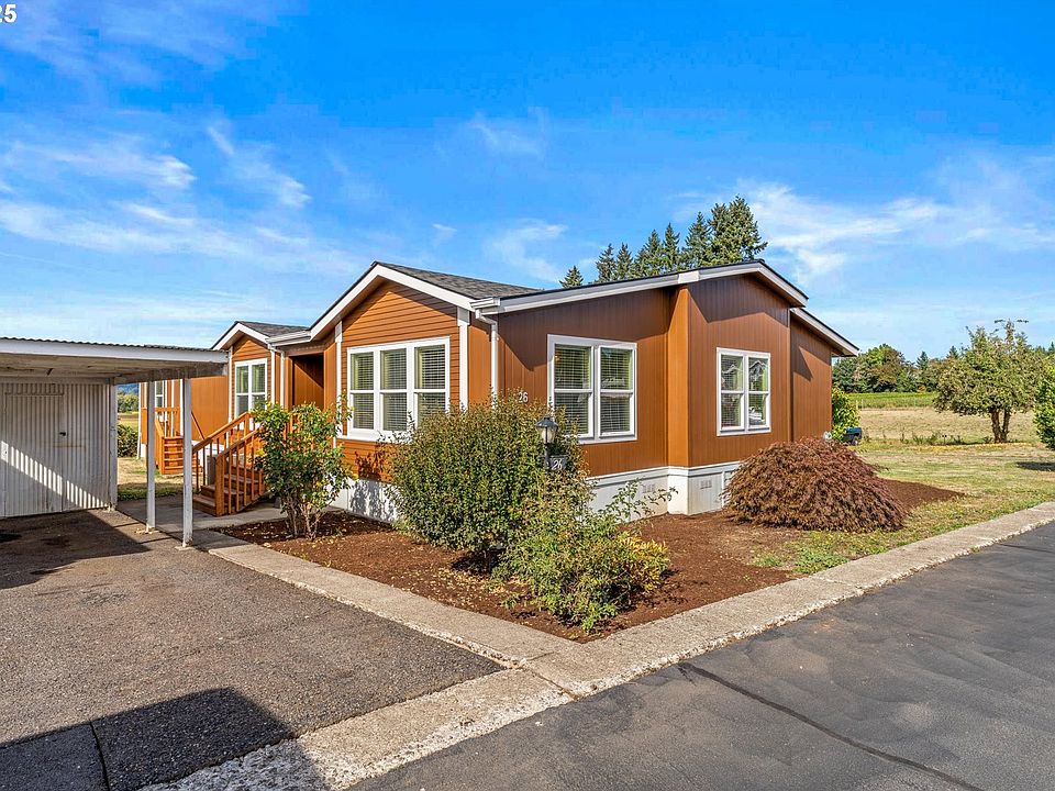 Rare find-Because of this 2754 sqft triple wide structure, the flow between rooms feels less “manufactured home” and more “traditional house.” The large corner lot allows room for outdoor enjoyment, gardening, or entertaining on a patio/lawn area allresting on a generous corner lot in a well maintained 55+ manufactured home park. With 4 bedrooms and 2 full baths, this residence captures a sense of roomy comfort without feeling impersonal. When approaching, you will notice the mature landscaping, rose bushes and a large handy shed for extra storage. For those with an RV or extra vehicles, there’s dedicated RV parking and storage right on site. The OVERSIZED corner lot allows room for outdoor enjoyment, gardening, or entertaining on a patio or lawn area.Inside you will be delighted to find high, and vaulted ceilings that create a lofty, open ambiance. An abundance of windows brings in natural light from all sides. You’ll find formal living and dining rooms that feel distinct yet connected, perfect for hosting family or guests in style.The heart of the home is the massive kitchen and pantry, anchored by a generous island and outfitted with full appliance set. Ample hard surface prep counter space and cabinet space, thoughtful workflow, and room for multiple cooks make this kitchen a central gathering place with appliances included.The floorplan balances private and shared space. Extra bedrooms provide flexibility for guests, hobby rooms, or offices, while the primary suite offers a retreat. Across the home, the interiors maintain a clean, bright and modern aesthetic with neutral finishes that make personalization easy.In all, this home offers a rare combination: spacious, light filled interiors; a premium corner site; and practical amenities like RV parking, storage, and a shed. It’s ideal for someone looking to enjoy comfortable, affordable, low maintenance living in a mature 55+ community. Must qualify $975mo space lease prior to offer acceptance.