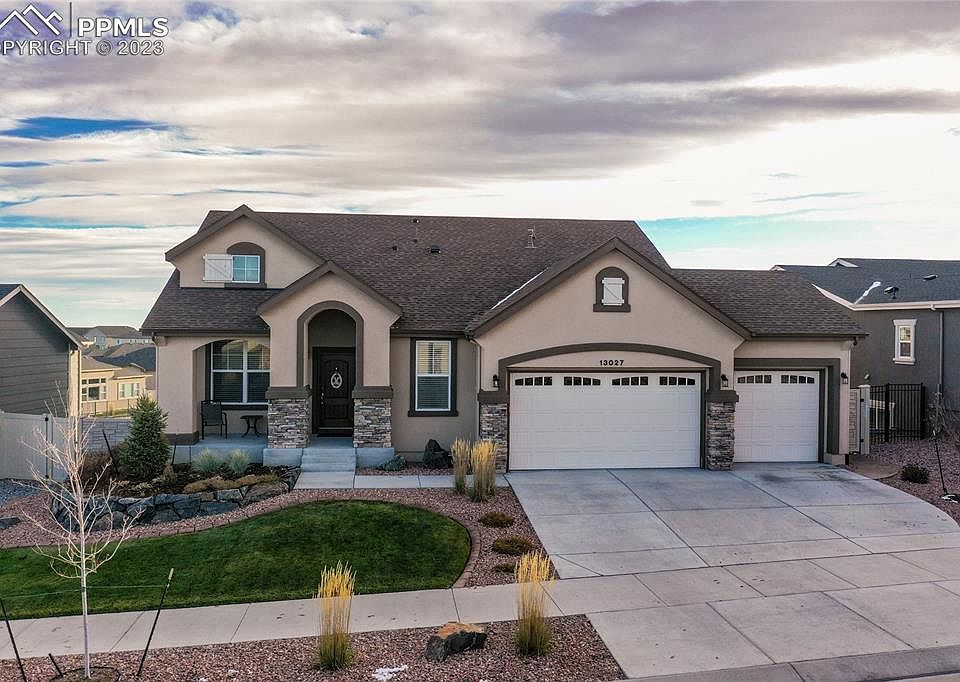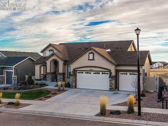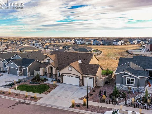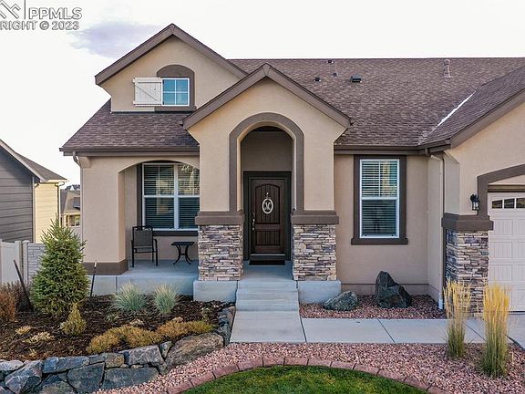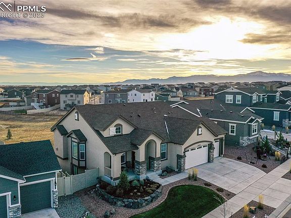 Amazing offering in Stonebridge at Meridian Ranch has so many upgrades and shows like new – you’ll have to take it all in for yourself. A covered front porch beckons you to come inside for a closer look. And once inside you are greeted with gleaming darker hardwood floors that set off the neutral color palate of the home. A dedicated office with French doors and bedroom with full bath welcomes you in and then your eye catches the appealing arches framing the formal dining room. Making your way to the open space basking in natural light from south-facing windows you find what you’ve been hoping for – an open floor plan between a cozy fireplace-flanked living room and gourmet kitchen in grey and white color scheme and you cannot believe your eyes. Upgraded kitchen appliances offer everything you could want including gas range and double ovens, plus plenty of cupboard and counter space, island, eating nook, pantry and granite counters with contemporary backsplash. As you finish touring the main level you find the primary bedroom as a spacious offering with two closets and yet another gorgeous upgrade in design in the 5-piece attached bath. The basement is fully finished and comes with two large bedrooms, both with walk-in closets, a beautifully appointed full bath with double vanities and a wet bar rough in. The space is amazing for creating areas for different activities such as entertainment, workout space, office, home schooling or playroom. And then you walk out to a professionally landscaped yard and huge stamped concrete patio with built-in fire pit, nicely sized grassy area and wrought-iron fence that creates a barrier for your home but allows you to enjoy the open space that flanks the southern end of your lot and includes views of Pikes Peak and the Front Range. The Stonebridge neighborhood offers a clubhouse with exercise facilities, pickleball courts and community garden. The home is conveniently located to shops, restaurants and quick access to Highway 24.