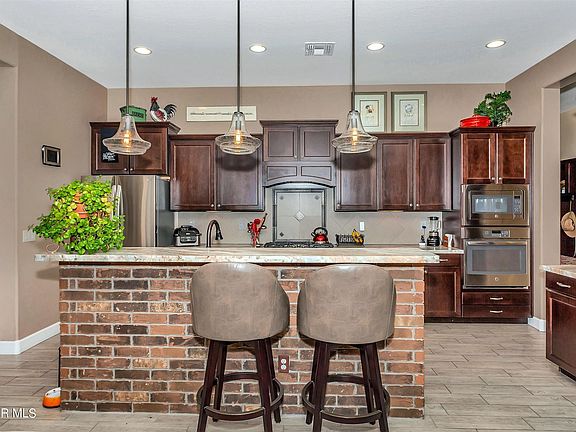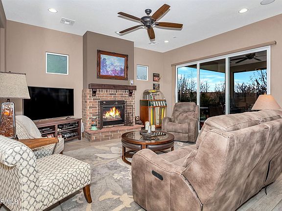 Highly upgraded previous model home features 10' ceilings, 8'doors, designer brick walls in the den & on the fireplace hearth, and matching on the breakfast bar! A leather-look quartz countertop in the kitchen and granite in both baths and the smart room! The garage in fully insulated and has built in cabinets. The patio has been extended and has a gas BBQ and many extra plants and trees. In the winter you have the mountain range view (no homes behind you) and in summer there is a ton of privacy and shade from the beautiful trees and plants. The lovely wood grained plank tile floors are not only beautiful they are easy to maintain. The entrance has a gorgeous security door and there are integrated nightlights in many outlets. MUST SEE - look at the attachment! See upgrade list