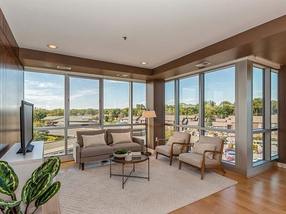 Desirable 4th floor corner condo at  Plaza on 5th.  Open floor plan with floor to ceiling windows and deck. Beautiful corner view overlooking Coralville, close to library, shopping, park, Coralville pool, restaurants,  and more. Condo has engineered hardwood floors, granite counters, tile backsplash, tile baths, stainless steel appliances and high end finishes throughout. 2 private parking stalls below the building plus storage unit included.