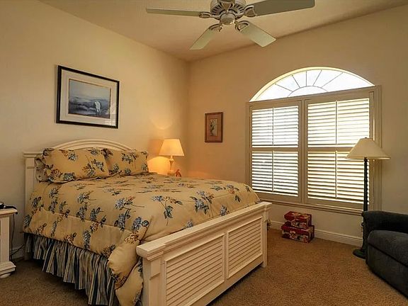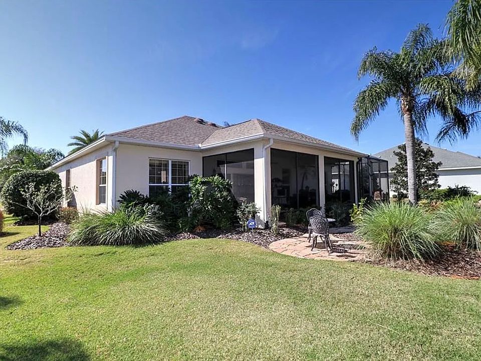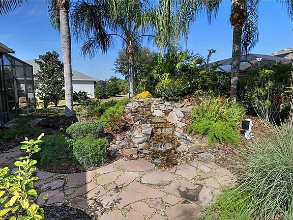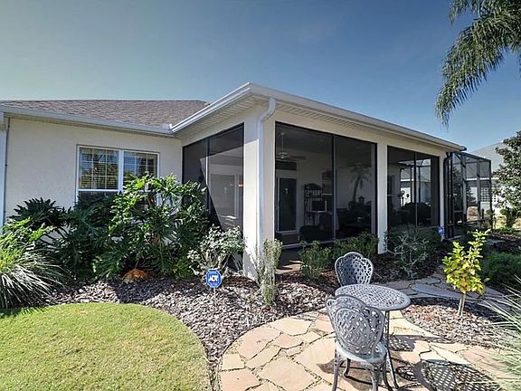 Located on a quiet cul-de-sac in the desirable village of Bridgeport at Lake Sumter, this home is CENTRALLY LOCATED close to Arnold Palmer Country Club and golf course as well as Lake Sumter Landing. Lush landscaping and driveway/walkway pavers combine to produce fabulous curb appeal. In the kitchen you will find granite counter tops and beautiful bisque cabinets with a cherry "bead" inlaid at the top molding. The main living areas feature ceramic tile on the diagonal and a tray ceiling in the living room. The master bedroom features a tray ceiling and engineered hardwood floor. The master bath has dual sinks and his/her walk-in closets; her closet is customized with built-ins. There are plantation shutters in all rooms except the back bedroom and many of the faucets and shower fixtures have been updated. There is a large lanai and birdcage with pavers overlooking a peaceful WATERFALL to enjoy. The outside was recently painted; a new roof was installed in 2024 and a new A/C in 2024. This lovely home has an open split floor plan.