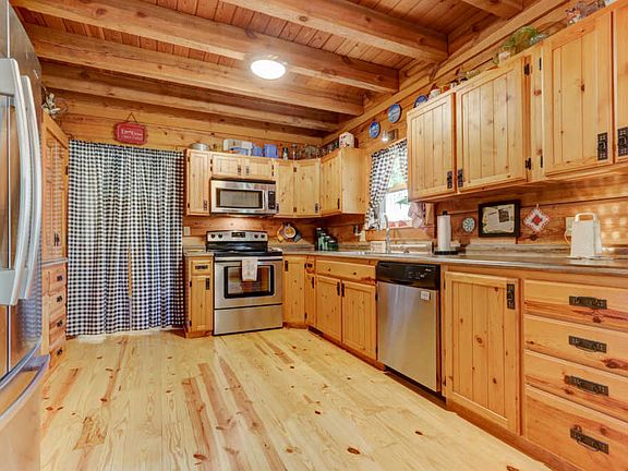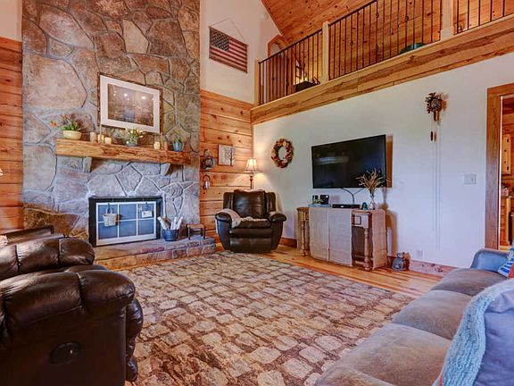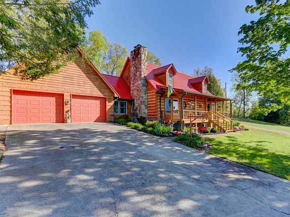 This true log home with a red metal roof sits in a mature neighborhood and has a massive stone fireplace in living room, master suite (large bed room, private bath with double sinks and large walk in shower, & huge walk-in-closet), kitchen with dining, utility room & 1/2 bath plus a mud room all on the main floor. Double doors in dining area lead to a screened-in-back porch & an open concrete patio for relaxing. Up stairs there are two bedrooms & one full bath, loft area & a Juliet balcony with a great view. The basement is currently used as a workshop and storage area but could easily be converted into more finished living space. Home remodeling items over the past two years include: New Rheem Sear 21 heat pump and furnace, New high efficiency hot water heater New paint, flooring, All new Andersen windows and storm doors, New stairs to loft and basement, New iron railing in balcony, Two year old appliances stay with home (stove, refrigerator,microwave), as does the washer and dryer, 10x16 yard barn with metal roof, two windows with screens and two lofts for additional storage as well as double entry doors, New landscaping and much, much more...