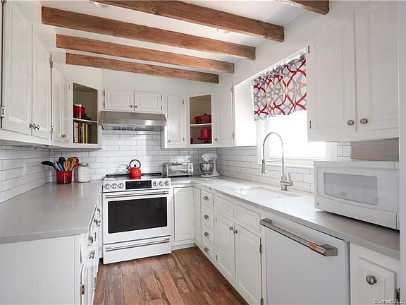 Beautiful antique cape, one of the oldest homes in North Stamford, with preserved charm yet modern updates. On a surprisingly large lot, with a fenced front yard and a deck out back leading to a large yard, it's perfect for entertaining both inside and out. With wide board hardwood floors throughout much of the house and two old stone fireplaces, you'll feel the 18th century charm from the moment you enter. The recently gut renovated eat-in-kitchen with new floor, walls, custom beams, custom matte GE Cafe appliances, custom bench seating (and more will be just what today's chef is looking for. Two bedrooms upstairs with a newer bath and recently restored walls and ceiling. The 3rd bedroom is on the first floor with sliders to the deck and is currently being used as a family room. First floor also has a large dining room and living room. Newer windows throughout the house, city water, and a 2 car garage with plenty of driveway space in a fantastic North Stamford location. Close to Merritt, shopping, the Stamford Nature Center and so much more. Take a trip back to 1756