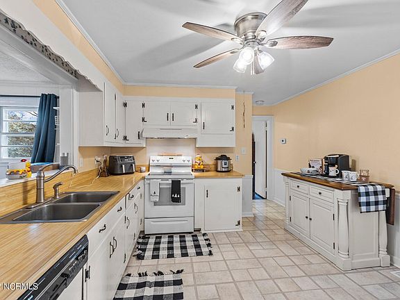 What a solidly-built home in the heart of New Bern where you're easily less than 8 minutes from any one of the town's main dining or shopping destinations! This classic ranch-style home is move-in ready and boasts: a newly painted living room, two bedrooms (including the master), and the master bathroom; newly refinished hardwood floors; previously updated bathrooms; a new water heater in 2022; and an updated main circuit breaker panel - no round fuses here! Other great features of your next home include: crown molding throughout; a large living room and family room with fireplace, both of which are wonderful spaces for entertaining; the majority of the flooring is either tile or wood; a light-filled sunroom; a pantry ready for your choice and placement of shelving; a large rear concrete patio; and an exterior storage building that has massive potential after some TLC. Cute, affordable, and conveniently located, this gem of a home is primed for immediate possession...in other words, you can move in as fast as you can buy her!