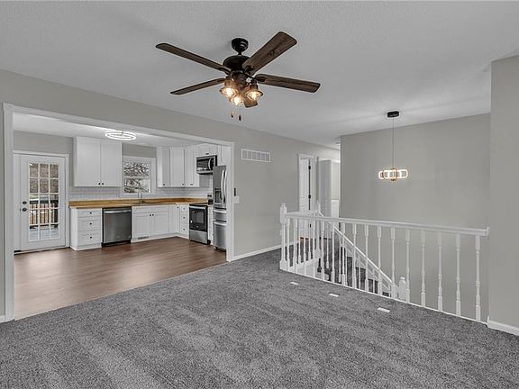 UPDATED SPLIT LEVEL ENTRY HOME! Neutral colors throughout makes this a GREAT OPPORTUNITY to MOVE RIGHT IN! Main level Living Room opens to Eat-In Kitchen complete with soft close White Cabinets--including pantry, Stainless Steel Appliances and Butcher Block Countertops. Deck access from here is perfect for outdoor cooking! Primary Suite has a walk-in closet and adjacent en-suite with double vanity! 2 more bedrooms, 2nd full bath and convenient laundry closet completes this level. Garage level entry leads to Family Room, 4th Bedroom and Half Bath! SPACIOUS Fenced in Yard to Enjoy All Things Outdoors! Oversized Garage for extra storage needs!