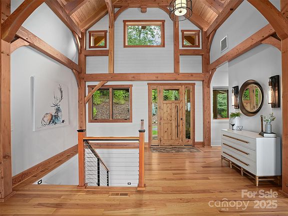 Nestled near the prestigious Champion Hills Golf Course community of Hendersonville, North Carolina, 1303 Solomon Circle is a masterpiece of architectural brilliance and refined luxury. This custom Timber Frame Hybrid residence, set on a rare 2.91-acre lot bordered by Pisgah National Forest, offers stunning long-range mountain views. Crafted with Douglas Fir interiors and Cypress beams, the home blends timeless craftsmanship with modern innovation, creating a sanctuary of comfort and sophistication. Spanning over 5,000 square feet on the main level, it embodies meticulous design and environmental harmony, delivering a lifestyle of elegance and serenity. The newly resealed driveway, framed by river rocks for soil retention and drainage, leads to a striking exterior sealed with Perma-Chink stain, harmonizing with the forest. SIP 6-inch walls ensure exceptional energy efficiency, surpassing Energy Star standards, while a Brazilian HVAC unit with variable speed control, heat exchange system, and Stratus fan provides year-round comfort. A 16 kW Generac generator ensures uninterrupted power. Recent landscaping, including Green Giant Arborvitae and a powder-coated aluminum fence enclosing 0.25 to 0.50 acres, creates a private oasis. A Trex deck with dog-friendly steps connects indoor and outdoor living, inviting residents to enjoy the mountain air. Inside, the Great Room features soaring timber beams, Douglas Fir interiors, and a stone masonry fireplace with concealed speakers, blending rustic charm with modern convenience. A gallery wall adds personal flair, making it a hub for gatherings. The open floor plan flows into the Kitchen and Breakfast Room, unified by wood ceilings and Cypress beams. Designed by House of Chloe, the kitchen boasts Wolf and Sub-Zero appliances, including a 42-inch refrigerator, Scotsman ice maker, and Asko dishwasher. Custom Walker Woodworking cabinets with leathered granite and a chef’s pantry create a functional yet inviting space. The Master Suite offers serenity with custom black metal and antique wave glass French doors opening to a private deck, ideal for enjoying sunsets over the Blue Ridge Mountains. The Master Bath features a walk-in shower with multiple heads, floor-to-ceiling marble, a frameless glass door, a soaking tub, dual vanities, and radiant heated marble floors, crafting a luxurious retreat. The Main Level Study, with Hickory floors, shiplap wainscoting, and unique lighting, serves as a refined workspace. The Powder Room, with a Mahogany and frosted glass door, custom vanity, and bold black accents, elevates intimate spaces. Outdoor living shines with a multi-level Trex decking system and stainless steel railings, offering unobstructed mountain views. The terrace level includes a Superior direct vent gas fireplace, a 300 GPM waterfall pump with UV filtration, a natural gas grill, and an electric spa tub. The 30-year architectural shingle roof and metal accents ensure durability and style. The Terrace Level expands functionality with a Family Room, wet bar, two Guest Suites with en suite baths, an exercise room, wine cellar, root cellar, and utility room. The oversized 2-car garage, with epoxy floors and storage, connects to a 2022-upgraded Bonus Room with a kitchenette and modern bathroom, ideal for a mother-in-law suite or studio. The Laundry Room, with stunning tile, LG washer and dryer, and a custom folding table, blends practicality with elegance. From the Hickory hardwood floors to the intricate Cypress beams, every element of 1303 Solomon Circle reflects luxury. The dual-speed HVAC with heat recovery technology ensures efficiency, harmonizing old-world charm with modern comfort. This residence is a retreat, a statement, and a celebration of refined living, where nature and craftsmanship elevate every moment.