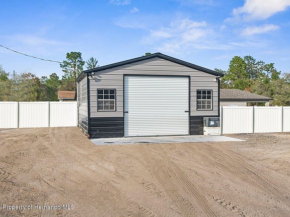 MOVE-IN READY!! NEWER GORGEOUS CRAFTSMAN CUSTOM HOME, built in 2022, offers 3 bedrooms + 2 bathrooms + 2-car attached garage + large detached metal building (20x20) + large covered back lanai (27x10) and large open patio for entertaining + RV hookup + completely fenced with white vinyl privacy fence + on a beautifully landscaped 1/2 acre corner lot! NO HOA. NO FLOOD (X Zone). Welcome your guests with your charming front porch with gorgeous stacked stoned, perfect for decorating for the holidays! Enter the home and feel how open and spacious it is with the open floor plan and high ceilings! The upgraded ceramic tile plank flooring is a beautiful feature...no vinyl floors here!! The large kitchen is the centerpiece of this home with its large island, double breakfast bars for extra seating! The kitchen offers upgraded marble countertops and lots of beautiful, real wood shaker cabinets for extra storage space, and newer stainless steel appliances! Formal dining room and large great room for the whole family to relax! Split floor plan for privacy for the master suite! The master bedroom is accented with a tray ceiling and has an ensuite bathroom with marble countertops, dual sinks, matching real wood shaker cabinets, oversized walk-in shower with frameless glass! The second bathroom offers matching finishes and a shower/tub combo with ceramic tiled walls! Enjoy your morning coffee on the back covered lanai which is spacious enough for a outdoor couch! The outdoor living space is extended with a large concrete patio to entertain your family and guests...grill out, sit around the fire pit, add a jacuzzi...it's a nice area to enjoy the moonlight and the stars in the evenings! The home offers 1,950 sq feet living space; 2,843 total square footage in the home + 400 square feet in the detached metal building/workshop. The detached workshop has power with its own electric meter, is well-built with a 5 inch concrete slab, 16x16 footers, a 7x20 concrete apron, 10x10 door and additional side entry door and windows to let in lighting and for residential appearance!! The area around the workshop building is fenced separately from the house with wide entrance gates to bring your extra vehicles, campers, boats, and toys into the fenced area which has crushed asphalt base for additional parking.