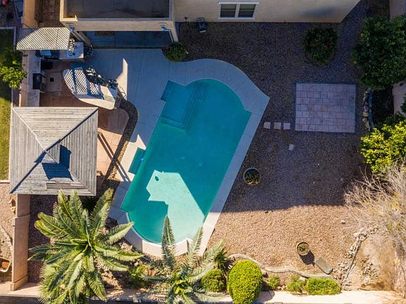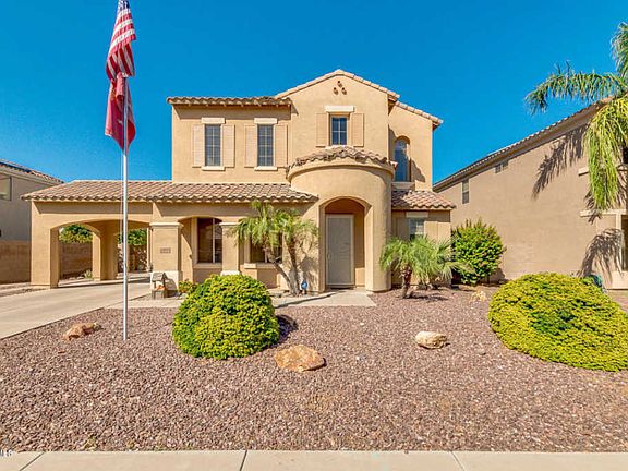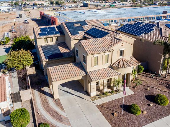 Welcome to this glorious space. You are investing in your lifestyle not a home. All the right space and all the classy upgrades. This home is conveniently located to new commercial construction that makes your life easy and convenient. Foyer opens to powder room, den, and fully custom bar and dining room. Multi space can be used for entertaining or formal entertaining. How about an owner who works from home and needs his space, you have that here. Windows everywhere offer natural light and breeze for the cool days. Walk into a kitchen nook and gourmet kitchen. Owners have a built in pantry with shelves for all your kitchen essentials. Did I mention slide out drawers in three of the cabinets next to sink? Granite countertops and island with cabinets. There is enough space for all the essent Essentials. Gas stove was upgraded by homeowners. Fully approved by APS. 16k KW Solar panels! Ask to see the bills and imagine the money you can spend outside of utility bills. Outside courtyard is superb and private. 3 car garage tandem. Paved driveway for your boat or toy hauler. Living room is cozy and leads to a backyard paradise. Let's go upstairs on custom bamboo flooring. It is a dual staircase. TWO Lofts - Did I mention new carpeting throughout. Downstairs has a full size bedroom, custom bathroom with unique yet sexy sink and custom shower doors. Upstairs master quarters is exquisite. French doors open up to private room fit for a King and his Queen. Jetted tub/separate shower and his and hers master closet. It all fits and the separate vanities leave no one feeling jealous. It's all there. All 3 guest bedrooms upstairs can fit king size bedroom sets. Did I mention the second LOFT? Maybe a second master bedroom? It is an entertainers paradise. The space in between the rooms and the lofts on either side of home are heaven. You have to see this home to appreciate the appointments. Let's go outside. The new pebbletech pool is done with detail and it boasts our American Flag imbedded in the tiles. The owners switched pool from saltwater to chlorine. Plumbed for a heater if so desired. Custom kitchen outside is ideal for dinners by the pool. A custom pergola is perfect for a fully functional outside kitchen. The palm trees make this home feel so exotic. There are fruit trees that give their owners fresh citrus to include grapefruits, tangerines, navals, and the neighbor shares their pomegranates. What are you waiting for? This home won't last and NOW priced to sell.