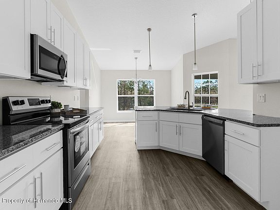 Active Under Contract - Accepting Back Up Offers Under Construction. GORGEOUS BRAND NEW CONSTRUCTION HOME without the unknown final cost and with a Builder's Warranty! MOVE-IN READY!! You only need to decorate it to make it your own!! 4 bedrooms + 2 full bathrooms + 2 car garage + LARGE covered lanai, landscaped with sprinkler system + on a PAVED road (almost a 1/2 acre). Enter the home though your beautiful entryway into the great room and OPEN FLOOR PLAN with high ceilings, lots of natural light, feels very spacious, light, bright, and comfortable with 1,908 sq ft living space and 2,590 total! NO HOA!! NO FLOOD!! Large great room + formal dining area + breakfast nook! Enjoy your morning coffee on your LARGE COVERED lanai or grill out with your family to enjoy your backyard with wooded lot line for a little privacy. The kitchen is upgraded with granite counter tops and breakfast bar for the whole family, 42' real wood white shaker cabinets, stainless steel appliances INCLUDING REFRIGERATOR! Enjoy beautiful views of your backyard and treeline from the large windows and sliders from most rooms of the home! The home is upgraded with gorgeous Luxury Vinyl Plank flooring throughout the home (waterproof, easy to care for and easy to keep clean - NO carpet!!), designer faucets, upgraded ceiling fans, designer light fixtures, and baseboards! The split floor plan offers privacy for the owner's suite!! The master bedroom is large and spacious at 20' x 12' with sitting area and a large walk-in closet! The ensuite bathroom is upgraded with matching real wood cabinets and granite countertops with dual sinks and a large walk-in shower with modern frameless glass! Enjoy peace on your side of the home! On the other side of the home are the 3 additional bedrooms and the second full bathroom with shower/tub combination, matching real wood shaker cabinets and granite counter top! The middle bedroom would also make a great office, gym, or playroom! Enjoy low electric bills as you have a new high-efficiency HVAC system, high-efficiency water heater, double paned windows and a well-insulated home!! New well, new septic. 2/10 Builder's Warranty is provided by Joseph W Mazzuco Construction, Inc., a well-known and reputable builder in our area. This is the Highlands 4 Model. Located in a growing area of Royal Highlands where everyone enjoys larger lots and more space between homes, NO HOA so you have the ability to park your boat, camper, toys in your side or backyard! Zoned for the county's newest schools Winding Waters and Weeki Wachee High School (K-12)! Only 10 minutes from shopping, groceries, schools, the state park with Mermaid Show and Buccaneer Bay Water Park, kayaking down the crystal-clear Weeki Wachee River, boating, fishing, swimming with the manatees, sunsets at Pine Island, Roger's Park on the river, and so much more! 15 minutes to the Suncoast Parkway for quick and easy access to Tampa and to some of the TOP US BEACHES in the country! Great price per square foot for a home where EVERYTHING IS NEW!! Come see it today! One or more photos is virtually staged. The photos are from another spec home nearby that just sold with some slight variation in granite color and paint color as Smart Interiors selected the colors and granite in this home! The new home should be finished mid to late June and ready for its new family to move in! Put it under contract now...it should be done by the time your loan is done!
