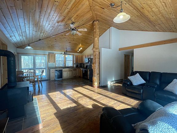 Discover peace and privacy in this 3-bedroom, 1-bath ranch home on 7.5 acres just east of Bemidji. The interior boasts a tongue-and-groove vaulted pine ceiling, six-panel pine doors, and custom wood kitchen cabinets with stainless steel appliances. A free-standing woodstove adds warmth and charm to the inviting living area.