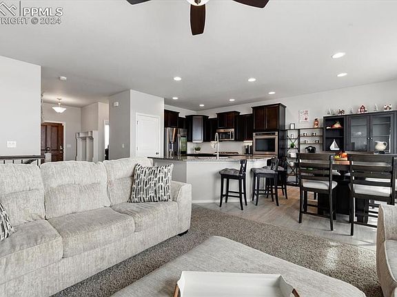 Stunning 5BR, 3BA WALK-OUT basement home in the serene Peyton community of Stonebridge at Meridian Ranch! Inside the storm door entry, you're greeted by a tiled interior foyer. Designed for both comfort & functionality, this home features an open floor plan ideal for entertaining guests. The main level showcases thoughtful details including iron rails leading to the basement, creating a seamless flow throughout. The living rm offers neutral carpet, a lighted CF, & a large window w/ backyard view. The dining rm & kitchen boast luxurious wood vinyl plank floors, w/ the dining area conveniently opening onto a composite deck through a sliding door, perfect for outside dining & relaxation. The island kitchen is a chef's dream, featuring a pantry, counter bar, espresso cabinets, granite countertops, & SS appl incl a dishwasher, microwave, gas cooktop & double ovens. The ML also hosts 2BRs w/ neutral carpet, offering versatility for guests or home office needs. The primary BR is a serene retreat, boasting a lighted cf, walk-in closet, & 4-piece ensuite bathroom w/ dual sink vanity, tiled shower w/ built-in seat, & makeup area. Descending to the Bsmt, discover a spacious family/rec rm w/ wet bar, perfect for movie nights or gatherings. 3 addtl BRS & full bathroom provide ample accommodations for family members or guests. A slider leads to the expanded patio & fire pit, extending the home's entertainment possibilities outdoors. Completing this exceptional property is a 3-car attached garage & fenced lot that backs up to open space, offering privacy & tranquility. Low maintenance xeriscaping, auto sprinklers, & a fenced dog run ensure easy upkeep of the outdoor spaces. Residents enjoy access to The Lodge, offering a gym, indoor activities, & event spaces, as well as the nearby Meridian Rec Center w/ pools, gyms, & courts. With its impeccable design, desirable features, & prime location, this home in Stonebridge at Meridian Ranch offers a lifestyle of comfort & convenience.