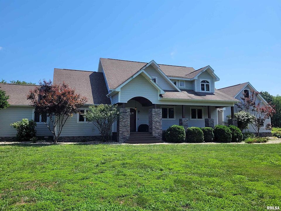 STUNNING Custom Built Home Near Rend Lake! Over 5000 square feet of luxury and 37 acres of an exquisite living experience. The open living area is flooded with natural light and has a grand floor to ceiling indoor/outdoor stone wood burning fireplace. The kitchen is a chef's dream with custom cabinetry, stainless steel appliances, quartz countertops and breakfast bar island. Off of the dining area, the french doors open up to the beautiful private setting extending your living experience with an above ground pool, a new hot tub, covered seating and outdoor wood burning fireplace. The primary bedroom features an impressive en-suite with an oversized shower and a wrap around walk-in closet behind the shower. New french doors have recently been installed to access the deck. Upstairs offers 2 more bedrooms and an open loft sitting room with elevated views of the fireplace. Full finished basement features a large family/rec room, 2 additional rooms utilized as bedrooms, full bathroom and ample storage.