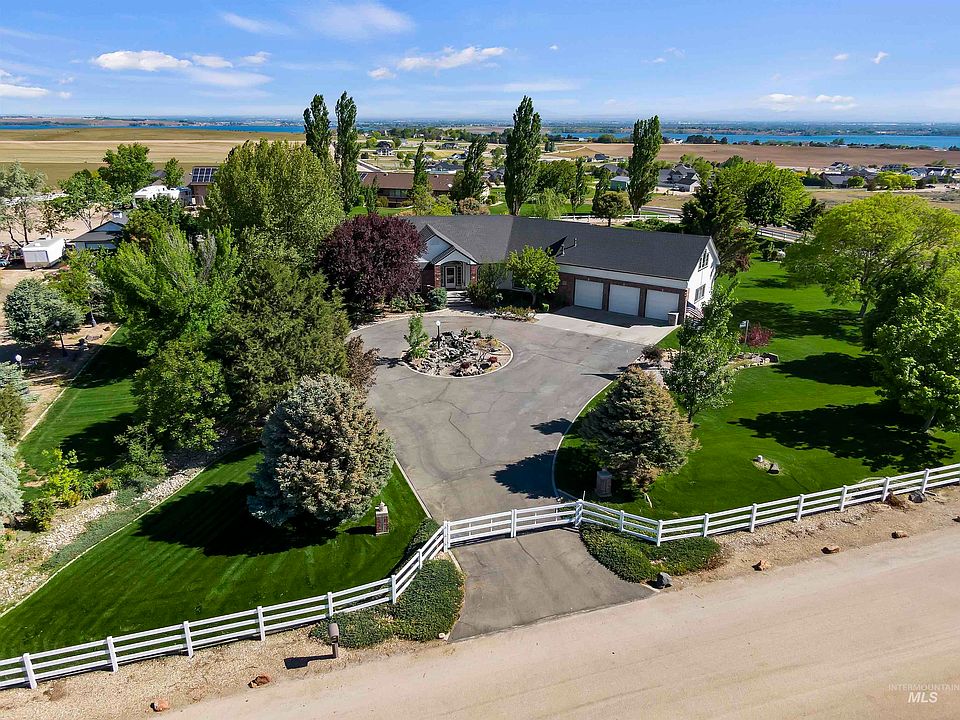 You've always dreamed of living in the country, and now's your chance. This 3000 sf home sits on 2.3 fenced acres with about 150 trees. Enjoy views of Lake Lowell and the Treasure Valley on one side and the Owyhees on the other. Fourth of July offers spectacular valley fireworks, or enjoy a tranquil star-filled night sky. The orchard provides great privacy, and the mature trees offer summer shade. The modern kitchen features new cabinets, granite countertops, appliances, and lighting. Hardwood floors span the main living areas, with laminate in the guest bedrooms and bonus room. The guest bathrooms and laundry room are fully updated with new tile, paint, and fixtures. The master bath boasts fresh paint, a walk-in shower, jetted tub, and a large walk-in closet. Relax in the hot tub off the master suite, surrounded by vibrant flowers and a starry night sky. The bonus room above the three-car garage is perfect for projects or a craft/sewing room. Entertain on the pergola, patio, and deck, or around the firepit.