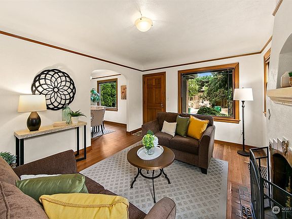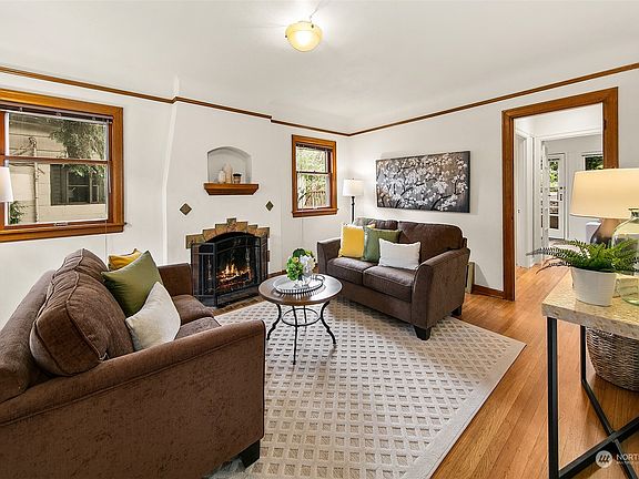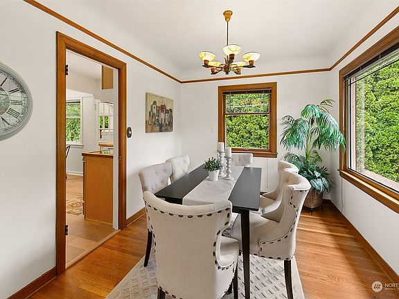 Lovely 1931 Haller Lake Tudor, relocated in the ‘60’s. Classic period details & thoughtful updates. Living room has windows on 2 sides, beautiful fireplace, hardwood floors & tons of character! Sunny kitchen with new counters & range, storage & separate entrance. Full bath with tile tub surround. French doors lead to West facing family room/office that open to a private deck. Upstairs: 2 bedrooms with new carpet + ¾ bath. Full daylight basement has separate entrance, shop space, 2 bedrooms, full bath a laundry room with potential for easy 2nd kitchen! More updates include fresh paint in & out & roof is less than 5 years old. 2 car carport with storage, large driveway & great backyard. Easy access to I-5 & future Light Rail stop on 130th!