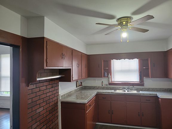 ** Rustic coubtry style kitchen . lots of cabinets surrounded by bricks