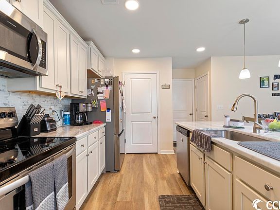 Welcome to this beautiful 4 bedroom, 2.5 bathroom home located in the desirable Oak Glenn community of Conway, SC. Situated on a cul de sac with a large pie shape lot, this home offers both privacy and space to enjoy the outdoors. As you approach the home, you are greeted by a beautiful front porch, perfect for enjoying your morning coffee or watching the sunset in the evening. Step inside to find a spacious and inviting living room with plenty of natural light. The kitchen is a chef's dream, featuring upgraded stunning quartz countertops, large single basin sink, stainless steel appliances, and ample cabinet space. The large island with a breakfast bar is perfect for meal prep or hosting guests. The dining area is situated between the kitchen and living room, making it perfect for hosting large gatherings or intimate dinners. The cozy primary bedroom is a true retreat, offering plenty of natural light, a large walk in closet and a spacious en-suite. This home also boasts light laminate flooring throughout, providing durability and easy maintenance. Three additional bedrooms, a laundry room, and full bathroom are located upstairs as well with plenty of ample storage throughout this home. The yard offers plenty of space for outdoor activities and entertaining, and the cul de sac location ensures peace and quiet. Oak Glenn owners are allowed to install in ground pools and the large side yard of this property would be a perfect location for one. Located in the highly sought-after Oak Glenn community, this home offers a peaceful and private retreat while still being just minutes from all the conveniences of Conway and Myrtle Beach. Don't miss your chance to make this beautiful property your new home!