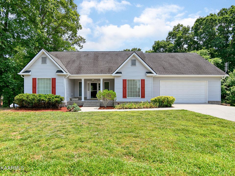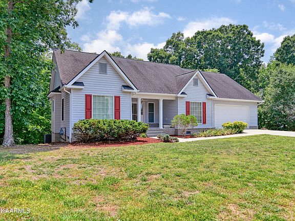 Charming Custom Built 3 bedroom, 2 bath cottage with welcoming covered front porch in a country setting with seasonal views of the Cumberland Mountains and Oak Ridge. Enter the home into the large family gathering space with cathedral ceiling and fan, original hardwood floors, and stacked stone fireplace with insert. Not to mention all the special enhancements like the glass pane pocket doors to quiet the kitchen noise and sliding doors to quiet noise for the separate bedrooms. Just off to the right is the kitchen with stainless steel appliances that stay and an island that has a large prep space and additional seating. The kitchen opens to a formal dining area or onto the expansive Trex deck just through the sliding glass doors. The deck offers private wooded serenity with wildlife (deer) that visit the wet weather spring that runs along the property line. Relax to the sound of the trickling water while enjoying the cool evenings. The split bedroom plan gives privacy inside the home. The primary bedroom has its own ensuite, double vanities, walk in shower, whirlpool tub, and walk in closet. The bedroom has a deep tray ceiling and also access to the deck through its own sliding doors. The other 2 bedrooms share a bathroom and are located in the opposite end of the house. This open floor plan is move in ready! It has been meticulously maintained and it shows with its curb appeal! The 2 car garage offers keyless entry. The oversized laundry room has room for appliances and also plenty of work space! NO STEPS Inside! NO HOA, No DUES, NO Restrictions known to owner! Extra storage in the walk in Tall Crawl space. This home is just minutes away from all the Conveniences of shopping, restaurants, medical facilities and 2 pristine lakes! Melton Hill and Fort Loudon Lakes are just minutes away!