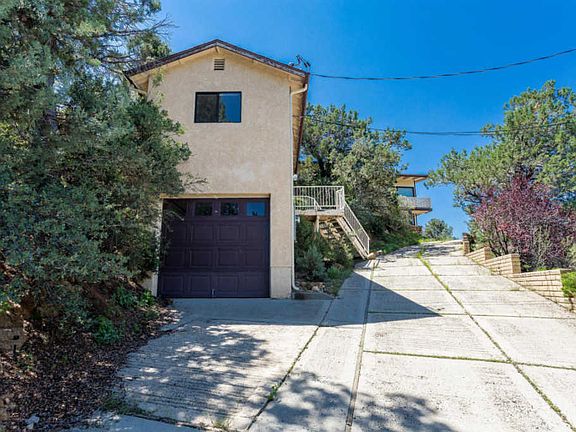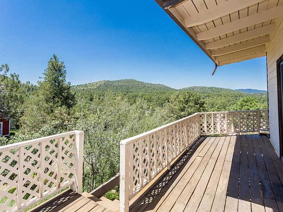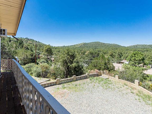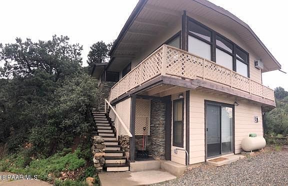Home is very clean and move-in ready! Main home is on upper level where you can relax on the balcony and enjoy amazing views of the Prescott National Forest. Sit out under the covered shelter in the yard and sip your coffee or entertain in the outdoor sitting area. Bedrooms, kitchen, and bath are upstairs, so you can live entirely on the upper level. Spiral stairs lead lead down to a single room with a woodburning stove that could be a rec room, guest room, or office. Workshop/storage area above the 1-car detached garage.