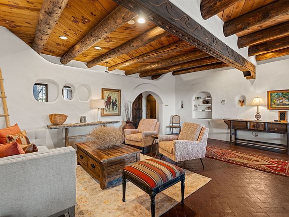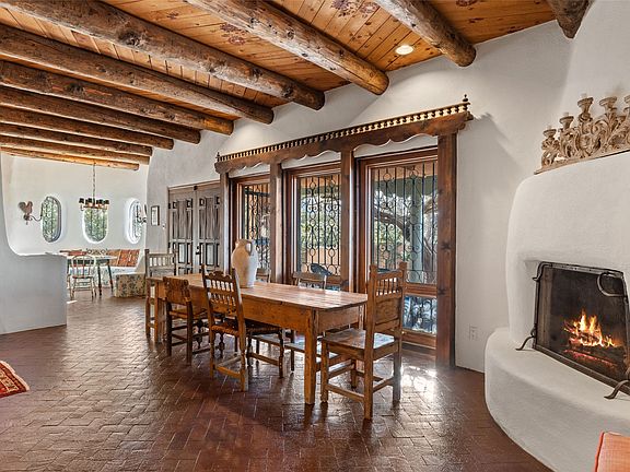 Savor the details of this elegant, romantic home: antique, hand-carved doors; exquisite ceilings with vigas, beams and stamped, herringbone decking; imported Portuguese tiles, built-in bancos and display nichos; gleaming brick floors; and three fireplaces exhibiting artisanal, wrought iron screens.