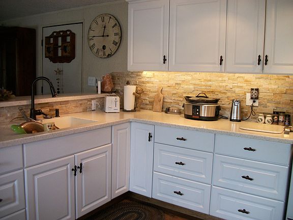 1988 Palm Harbor beauty. Remodeled kitchen tastefully with corian counter tops with under mount sink, stacked stone back splash, all new cabinets and serving bar, under counter lighting, and garbage disposal. Large master bedroom with en-suite with double sinks and handicap toilets. Laminate flooring . Storage or office space or spare bedroom was added. New window treatments throughout. Nice private patio with furniture. New fans, too much to mention. This will not last long!