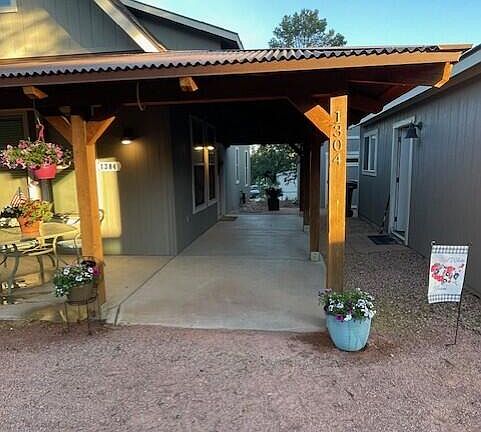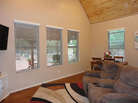 Welcome to this charming and pristine A-frame mountain style home that is enhanced with a gorgeous partial wrap around front porch made of wood and metal, to enjoy the amazing mountain weather. Property has desirable low maintenance landscaping, 2 large storage sheds (each measuring 12' x 16') and a 2 car garage. Home features a greatroom floorplan with 2 bedrooms downstairs & primary bedroom upstairs. Owner has been meticulous with maintenance and home boasts upgrades such as leather-finish granite, maple cabinets, recessed LED lighting, dual pane windows, stained concrete flooring, custom aspen tongue & groove inlaid vaulted living room ceiling, plus custom tiled showers in both bathrooms. Home is less than 10 years old and additional features include a completely fenced yard with a rolling security entry gate and paver driveway. Home is all electric and all interior appliances are less than 3 years old, which includes a 50 gallon water heater. With refrigerator, washer and dryer included, this home is move-in ready!!