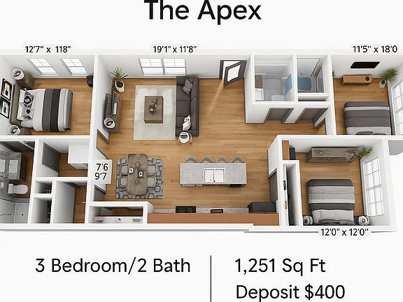 Luxury finishes throughout: Granite countertops with a waterfall edge, stainless steel appliances, and luxury vinyl plank flooring