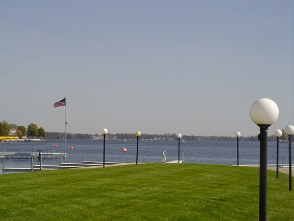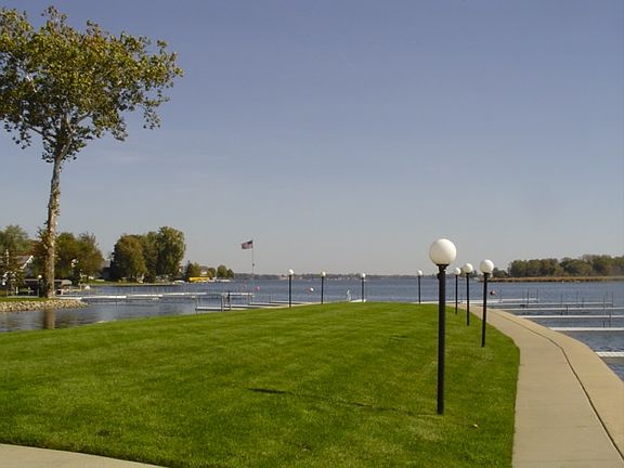 An end unit, first floor condo with 3 bedrooms, 2 full baths and a view from the front wall of windows as well as the side windows! Walk out the slider door onto a covered patio where you can enjoy the lake views and the breezes. All the appliances are updated stainless steel in the kitchen that is all open to the windowed living area!The hall bath has a closet with new front load washer and dryer. The entrance and hallway are tiled, bedrooms are carpet as is the living room/dining area. Great shades at the windows, ceiling fans in every room, central air, gas forced heat and city water, city sewer. Macy's Condos are close to town, eateries, workout facility and boat marinas. Pier space for your boat and from this end unit, easy to see your boat. Water in front of this condo and water on the side, you are always at the lake!