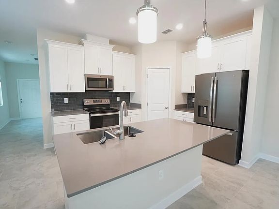 This recently built 2-story home offers 2500 square feet of modern living space, highlighted by high ceilings that create a bright, airy atmosphere. The open floor plan connects the living area, dining space, and kitchen, featuring 42-inch cabinets and Energy Star slate appliances. Also includes quartz countertops and upgraded tile flooring in main living areas. Enhancing both comfort and efficiency, this home features double-panel windows and smart home technology. The home includes four spacious bedrooms, with one conveniently located on the ground floor next to a full bathroom. The upstairs master suite provides a private retreat with a walk-in shower and double vanity, while the guest bathrooms features a shower-tub combo and a large vanity. Enjoy Florida's weather on the covered front and back porches. The property also includes a 2-car detached garage. With direct access to Highway 417, it offers easy commuting and is close to quality schools, shopping, and dining. Community amenities include a large pool, 2 playgrounds, 2 dog parks, and a nature trail for outdoor activities.
