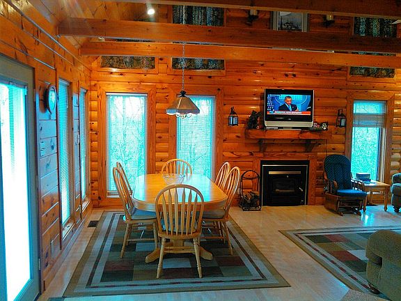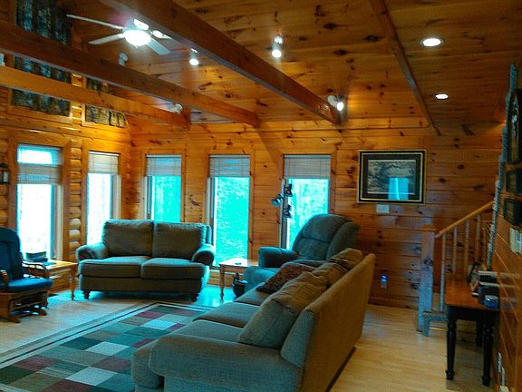 Exterior "D-log" wood finish, Interior Knotty pine throughout. Open floor plan on first floor, loft upstairs with vaulted ceiling, 2 Master suites. Kitchen cabinets are maple. Additional 6.37 acres with house.