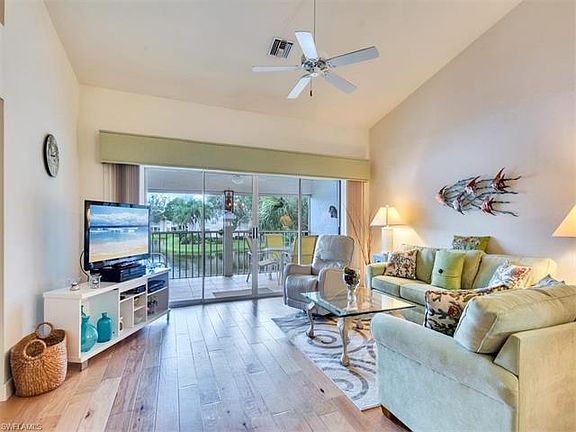 Come and see this beautifully maintained, turnkey furnished, second floor unit with hardwood floors and vaulted ceilings located in IMPERIAL GOLF ESTATES. This unit has a split bedroom plan with the Master Bedroom overlooking the lake and sliding doors onto the lanai. There are beautiful hardwood floors in the living area and carpeting in the bedrooms. Lots of windows and doors that make this unit light, bright and airy. All of the buildings in Bermuda Greens have recently been painted and have beautiful new Tile roofs without special assessment to the owners. Bermuda Greens is situated in a very peaceful and quiet setting surrounded by golf course and lakes but is centrally located, close to beaches, shopping, airport and The Mercato for night life and dining. HOA includes water and cable. Private golf and social memberships are available, but not mandatory, at the beautiful and elegant Imperial Country Club.