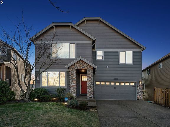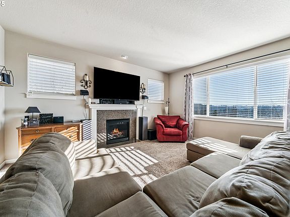 This spacious 5-bedroom + den, 3.5-bathroom home in Happy Valley offers breathtaking views of Mount Hood and the valley. Enjoy granite countertops, stainless steel appliances, gas range, high ceilings, ample natural light, primary bedroom with vaulted ceilings, gas fireplace, large soaking tub & walk in closet. Lower level includes family room with gas fireplace and bedroom with full bath, ideal for multi-generational living. Enjoy a spacious fenced backyard, complete with green grass, raised garden beds and fruit trees. Located near parks, trails, coffee shops and shopping centers, including a 7 min walk to New Seasons!