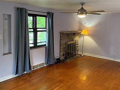 Adorable 3bdrm 2bath which can be accessed from Petermans Lane equaling almost a whole acre! Original hardwood on main floor! Log burning fireplace in living room! Beautiful updated full bath on main floor and also a full bath in basement! This home offers a spacious eat-in kitchen and a large finished basement area with bar. Great for entertaining! Then step outside to a private back patio and extra large backyard with firepit and garden. New ceiling fans, storm doors & garage door. Tons of potential with this space and rare to the Penn Hills area. Walking distance to public transit and restaurants. 5 min to Rt376, 10 min to PA Turnpike and 20 min to downtown PGH Owner pays water, Heat, Gas, Electricity