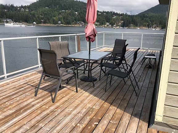 Discover waterfront bliss in this upgraded 2-bedroom cabin with a glass-sided deck. Perched at the water's edge, it offers stunning views. Step out from the upper level's sliding door to a rooftop deck with a 180-degree harbor panorama, perfect for outdoor relaxation. The upper loft bedroom includes a full bathroom, while the main-level bedroom has a half bath, alongside a cozy living and dining area. Set on a nearly half-acre zoned C2, potential uses include motel, campground, restaurant, B&B, marina, or foreshore activities. A new dock application is underway. Just 5 minutes from Madeira Park for groceries.