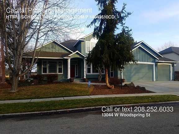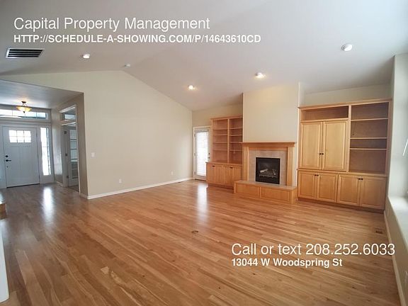 SCHEDULE A SHOWING ONLINE AT: showmojo.com/lh/14643610cd Gorgeous custom built home in Hobble Creek Sub. Off Eagle Rd and McMillan. Near Target, HP, West YMCA. Backs up to Hobble Creek Park. Walk to Cecil Andrus Elementary and Lowell Scott Middle. Large wrap around front porch. Hardwood throughout most of main level. Two offices, one with a full wall bookcase. Living room features gas fireplace, built shelving. Great room kitchen with large dining space, island, pantry, gas range, stainless steel appliances and tons of counter space. Main floor master bedroom with vaulted ceiling. Attached bath with dual vanity, soaker tub, stand-alone shower, private toilet and over-sized walk in closet. Upstairs features two more bedrooms, a full bath and a HUGE walk in storage room. Downstairs features another large storage room, family room - complete with fridge and microwave. Two more bedrooms and another full bath. Gas heat. Central vac, 3 car garage with auto openers. Fenced backyard, auto sprinklers, patio area. Backs up to park for a gorgeous view. Gate opens to walking path to get to the YMCA. 6 or 18 month lease with option to renew for 12. Deposit $2000. Tenant to pay all utilities and responsible for lawn care. Sorry, NO ROOMMATES. Max one pet under 60 lbs negotiable with additional deposit. Pet rent of $25 will also apply. Schools (subject to verification by applicant). Cecil Andrus Elementary, Lowell Scott Middle, Centennial High