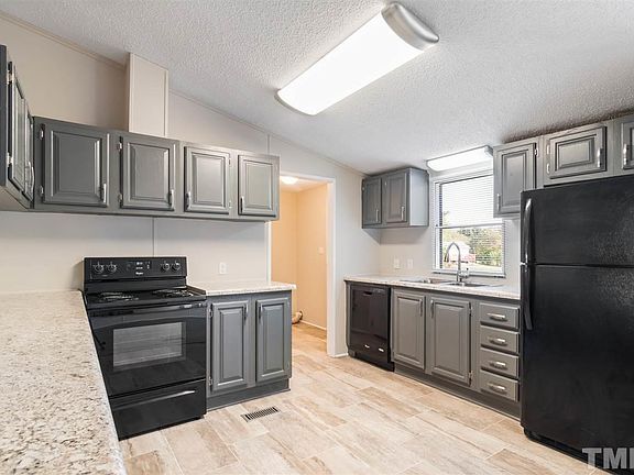 Welcome to country living in this quaint mfg. home on over an acre. Move-in ready, set in a great Clayton location w/views and nearby Flowers & Shopping. Enter this 3 bdrm., 2 bath home from the front covered porch to an updated, open concept living room, stylish kitchen & baths w/new counter tops, newer flooring & appliances. Lovely french doors lead to large deck on back to entertain guests & enjoy nature on a mature treed lot. Sep., laundry, brand new roof. This wonderful place is calling you home!