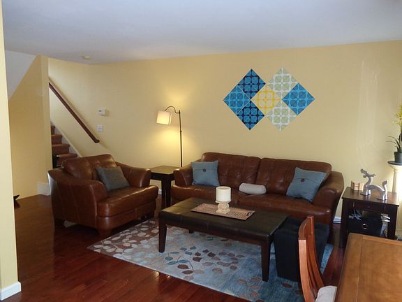 Stunning townhouse located at desirable Sterling Woods offering many upgrades: a pretty color palette and attractive light fixtures throughout, hardwood flooring in living room, kitchen and landings-new carpeting in bedrooms and den-gourmet kitchen with stainless appliances, gas stove, glass backsplash, granite counters and bay window breakfast area. The lovely master bedroom has a walk-in closet and paddle fan, the guest bedroom is sunny and bright, the living room has a gas fireplace and slider to private deck-the den also has a slider to a private patio. There are lots of windows and nice light streaming into the home. There is a pool and a clubhouse for your enjoyment. The home backs up to open space and offers easy access to major routes.