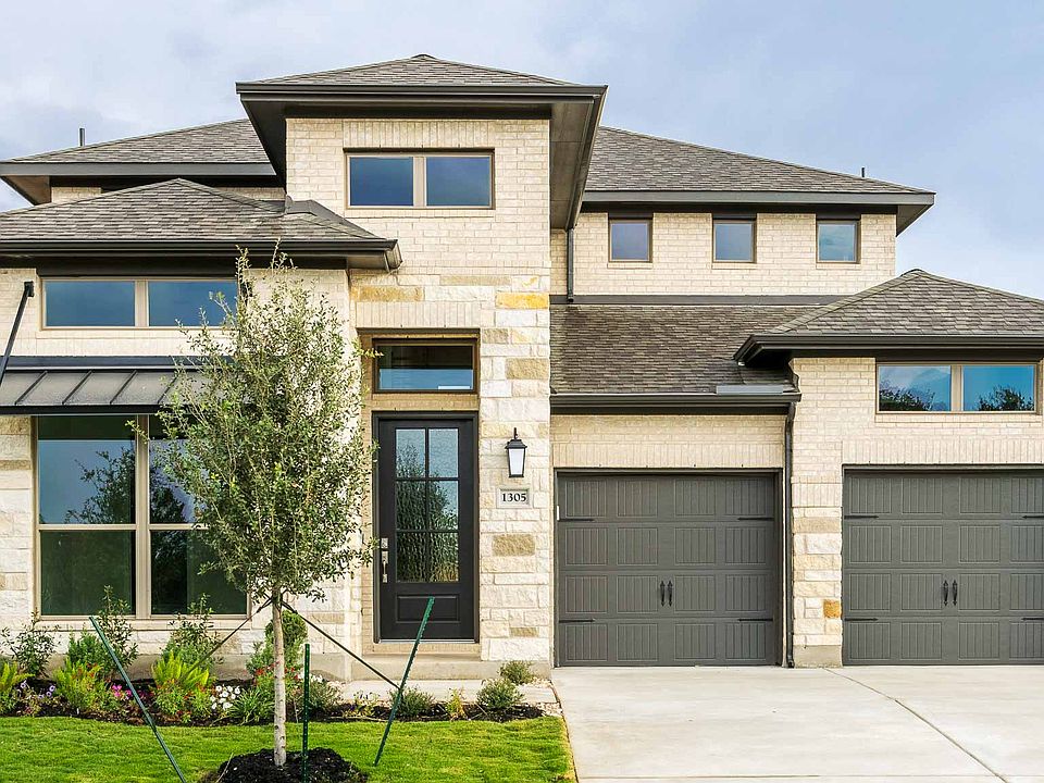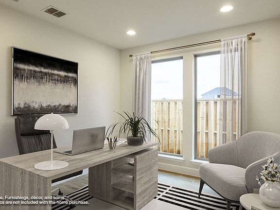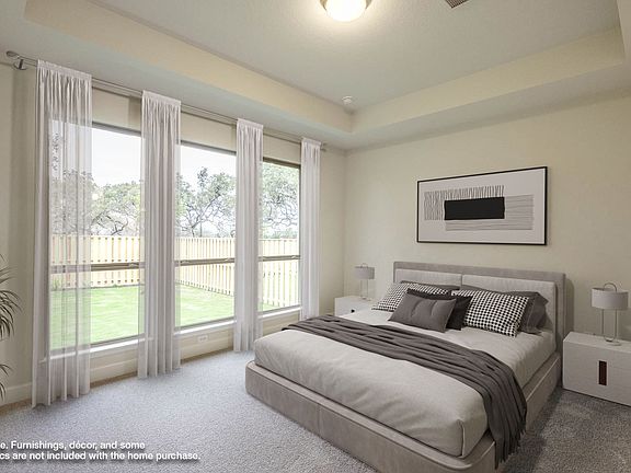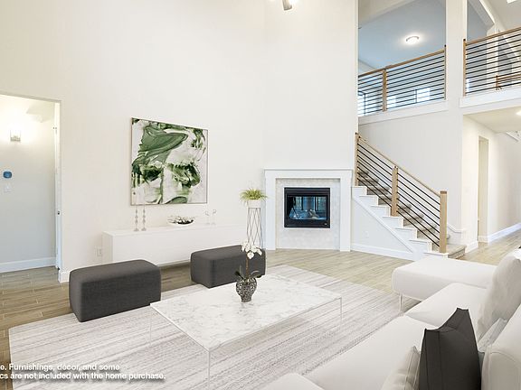Home office with French doors set along one side of two-story entry. Kitchen and dining area open to two-story family room. Kitchen features corner walk-in pantry and generous island with built-in seating space. Two-story family room features a wood mantel fireplace and wall of windows. First-floor primary suite includes bedroom with 10-foot ceiling. Double doors lead to primary bath with dual vanities, garden tub, separate glass-enclosed shower and large walk-in closet. First-floor guest suite offers private bath. Game room and two secondary bedrooms are upstairs. Extended covered backyard patio and 8-zone sprinkler system. Mud room off three-car garage. Representative Images. Features and specifications may vary by community.