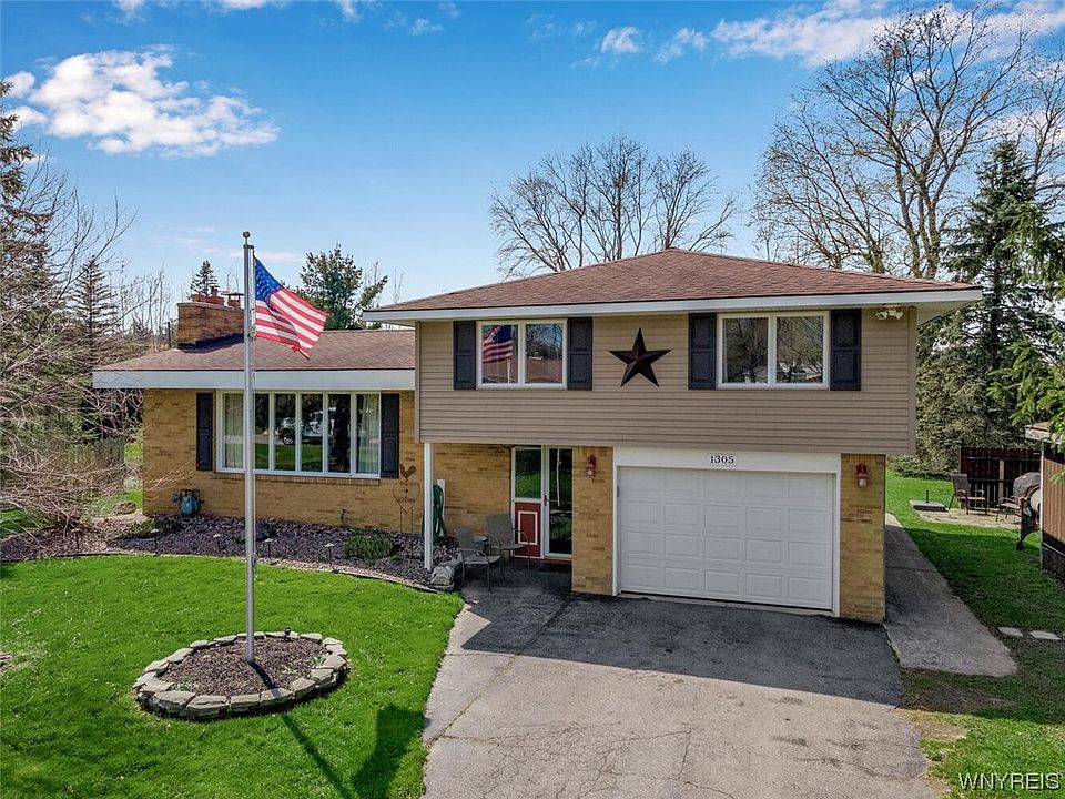 You do not want to overlook this lovely home in Alden!! Charming split level with 3 beds & 1.5 baths. Corner lot, no neighbors to the right or the rear, next to green space, Alden town takes care of the park. Ground level front dr entry, 1.5 car garage, 1/2 bath & FR w/ sliding dr to the back patio. Gorgeous vaulted ceilings with wooden beams draw your attention on the entire 2nd level!! Open concept LR & DR with wood stove & a mantle to decorate. Hardwd flrs & another sliding dr to the composite deck with vinyl rails & awning! Completely renovated kitchen with maple cabs, corian countertops, SS appliances (all included) tile floors & even a skylight! On the upper level, there is a full bath with custom tile & walk in shower. Plenty of closet space in all 3 bedrooms. Primary bedroom could fit a king size bed! Laundry in basement, generator hook up & glass block windows. The outdoor living space/room to entertain here is incredible: Lot size of 100'x200. 3 sheds (all w/ electric) help for additional storage so you can park in the garage all yr! This home has been well maintained & loved for 40 years!! Showings begin NOW. Offers will be due by 10 AM on FRI 5/19!