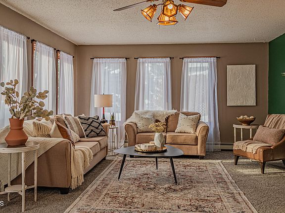 Unique and cozy home that's move in ready! This property is loaded with charm and updates. All new carpet and vinyl flooring throughout, Anderson windows, keyless entry, upgraded ceiling mount- dual shower head, triple bowl kitchen sink, and so much more. The 16 x 24 family room addition was built on in 1998. Upgraded 10,000 BTU A/C unit on upper level was replaced in 2020 and living room unit in 2021. The upper level has a beautiful primary suite plus a bonus living space with walk out access to the balcony style deck. Under all that snow is a beautiful park like yard with large blue spruce trees, firepit with patio pavers, rose and lilac bushes. Underneath the deck is a 4 x 8 enclosed area for extra storage. The oversized, double stall detached garage is fully insulated with a heater. This is a one-of-a-kind home, come take a look today!